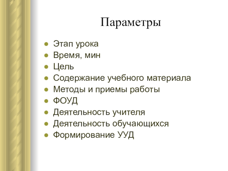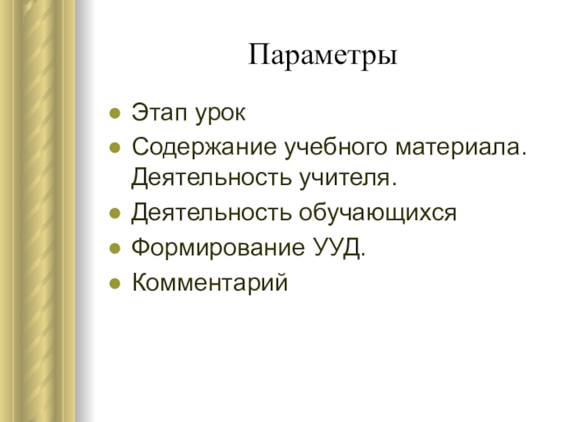 Этап урокСодержание учебного материала. Деятельность учителя. Деятельность обучающихсяФормирование УУД.Комментарий Параметры