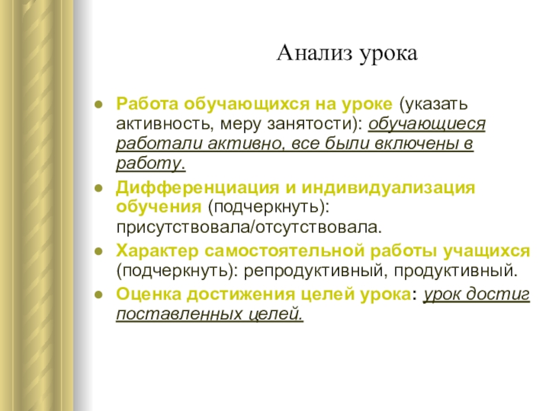Анализ урока Работа обучающихся на уроке (указать активность, меру занятости): обучающиеся работали активно, все были включены в  работу.Дифференциация