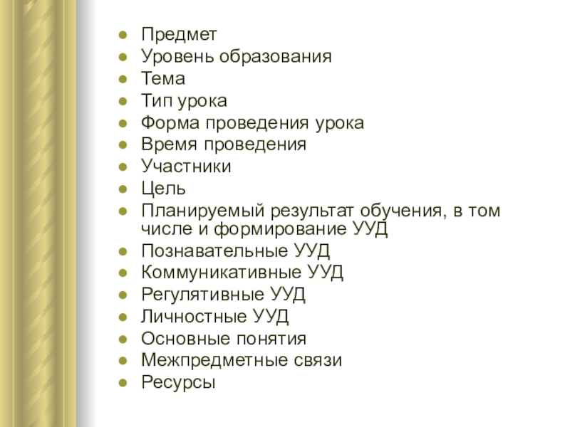 ПредметУровень образованияТема Тип урока Форма проведения урока Время проведения Участники Цель Планируемый результат обучения, в том числе
