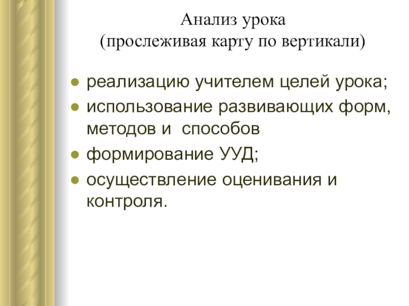 Анализ урока  (прослеживая карту по вертикали)реализацию учителем целей урока;использование развивающих форм, методов и способовформирование УУД; осуществление