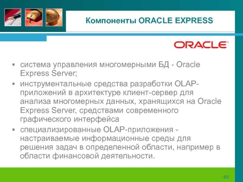 Слайд 53Специализированные OLAP-приложения Oracle Express