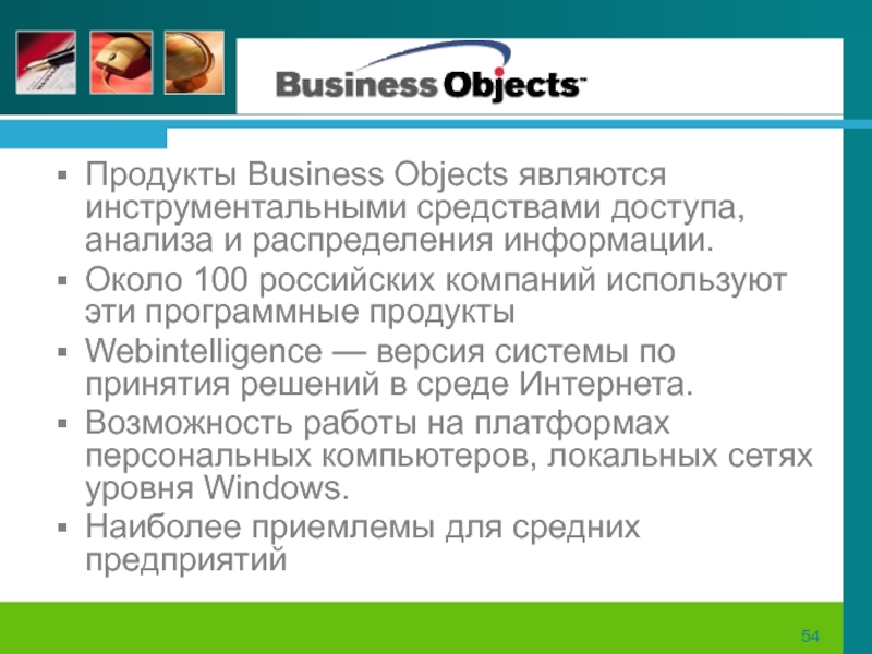 Слайд 54Продукты Business Objects являются инструментальными средствами доступа, анализа и распределения