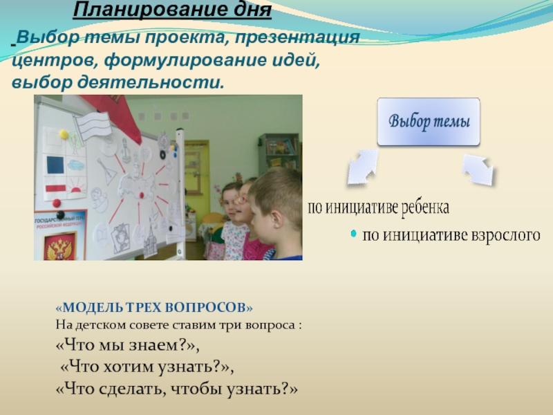4. Планирование дня (выбор темы проекта, презентация центров, формулирование идей, выбор деятельности).