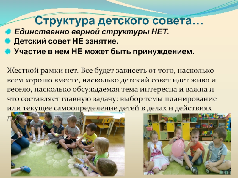 Участие в Детском совете возможно для детей любого возраста. Дети обладают значительно большим потенциалом, чем предполагают взрослые. При соответствующей поддержке они могут осознанно и целенаправленно принимать участие в определении дневных дел, могут четко сказать, что им нравится / не нравится, рассказать о своих идеях и представлениях, дать оценку своим идеям, делам и действиям и действиям других. Культура участия может быть сформирована только при постоянной ежедневной практики.