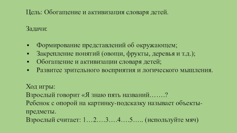 Предлагаю Вашему вниманию другой вариант этой игры.Эффективность и практическая значимость. С помощью слайдов, выполненных в программе Power Point, вы получите серию картинок формирующих определённые понятия и представления об окружающем мире.