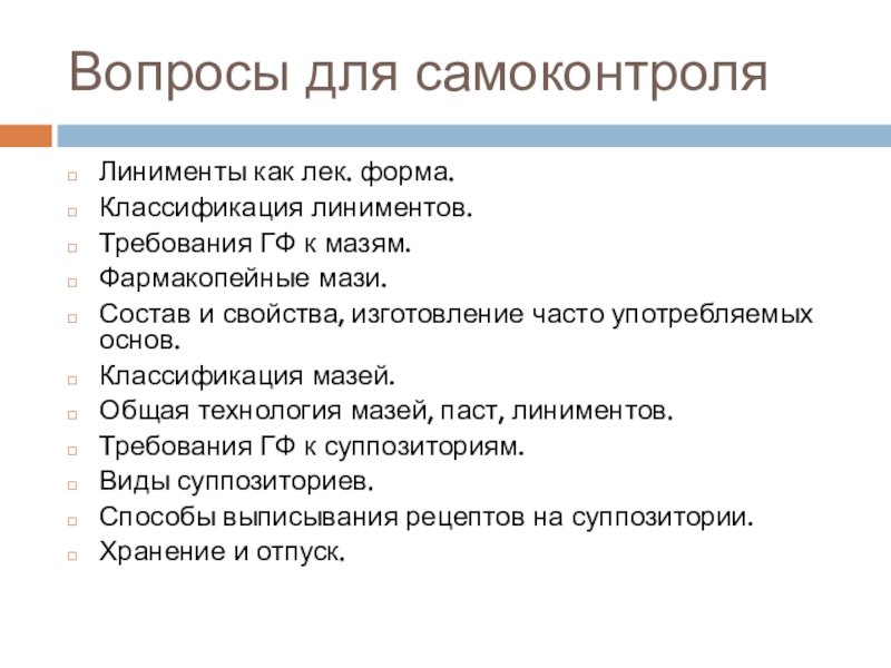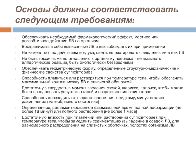 Достаточную вязкость при плавлении или растворении суппозиториев при температуре тела, чтобы замедлить седиментацию (выпадение в осадок) ЛВ, для равномерного распределения на слизистых оболочках, полостях организма ЛВ