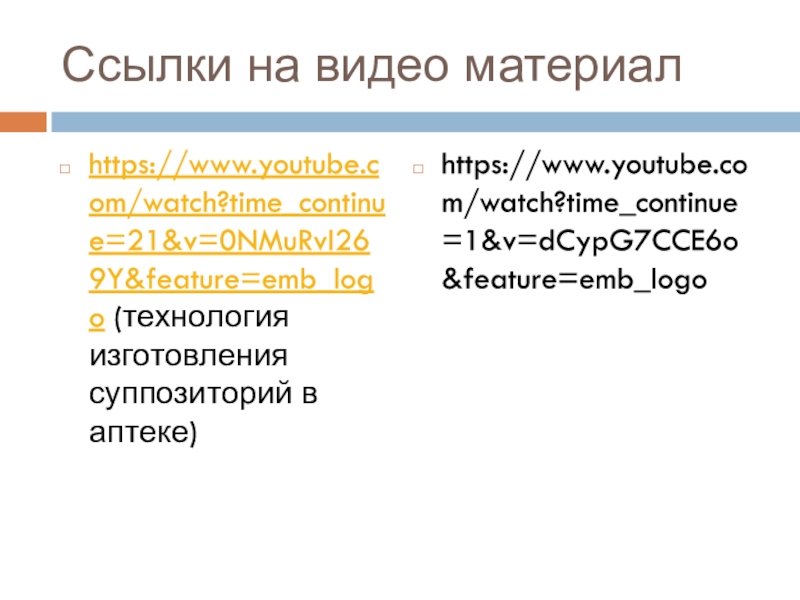 https://www.youtube.com/watch?time_continue=21&v=0NMuRvI269Y&feature=emb_logo (технология изготовления суппозиторий в аптеке)