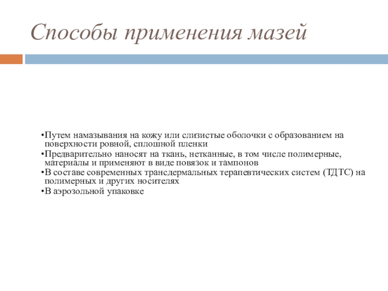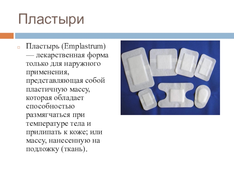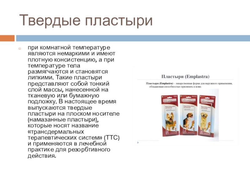 пластыри представляют собой тонкий слой массы, нанесенной на тканевую или бумажную подложку. В настоящее время выпускаются твердые пластыри на плоском носителе (намазанные пластыри), которые носят название «трансдермальных терапевтических систем» (ТТС) и применяются в лечебной практике для резорбтивного действия.