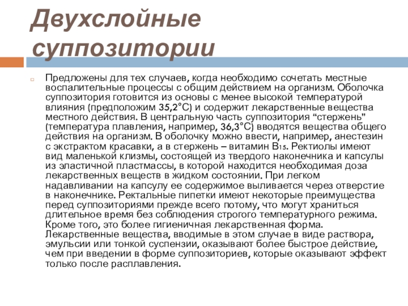 из основы с менее высокой температурой влияния (предположим 35,2°С) и содержит лекарственные вещества местного действия. В центральную часть суппозитория “стержень” (температура плавления, например, 36,3°С) вводятся вещества общего действия на организм. В оболочку можно ввести, например, анестезин с экстрактом красавки, а в стержень – витамин В15. Ректиолы имеют вид маленькой клизмы, состоящей из твердого наконечника и капсулы из эластичной пластмассы, в которой находится необходимая доза лекарственных веществ в жидком состоянии. При легком надавливании на капсулу ее содержимое выливается через отверстие в наконечнике. Ректальные пипетки имеют некоторые преимущества перед суппозиториями прежде всего потому, что могут храниться длительное время без соблюдения строгого температурного режима. Кроме того, это более гигиеничная лекарственная форма. Лекарственные вещества, вводимые в этом случае в виде раствора, эмульсии или тонкой суспензии, оказывают более быстрое действие, чем при введении в форме суппозиториев, которые оказывают эффект только после расплавления.