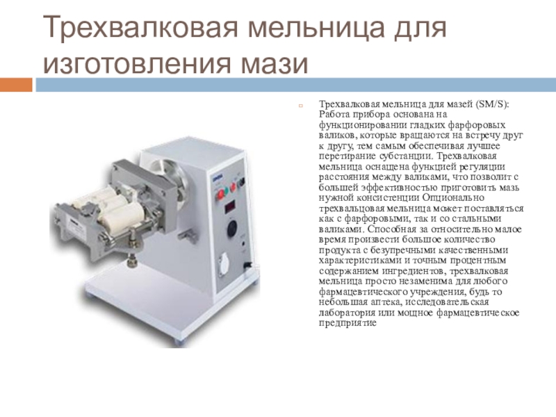встречу друг к другу, тем самым обеспечивая лучшее перетирание субстанции. Трехвалковая мельница оснащена функцией регуляции расстояния между валиками, что позволит с большей эффективностью приготовить мазь нужной консистенции Опционально трехвальцовая мельница может поставляться как с фарфоровыми, так и со стальными валиками. Способная за относительно малое время произвести большое количество продукта с безупречными качественными характеристиками и точным процентным содержанием ингредиентов, трехвалковая мельница просто незаменима для любого фармацевтического учреждения, будь то небольшая аптека, исследовательская лаборатория или мощное фармацевтическое предприятие