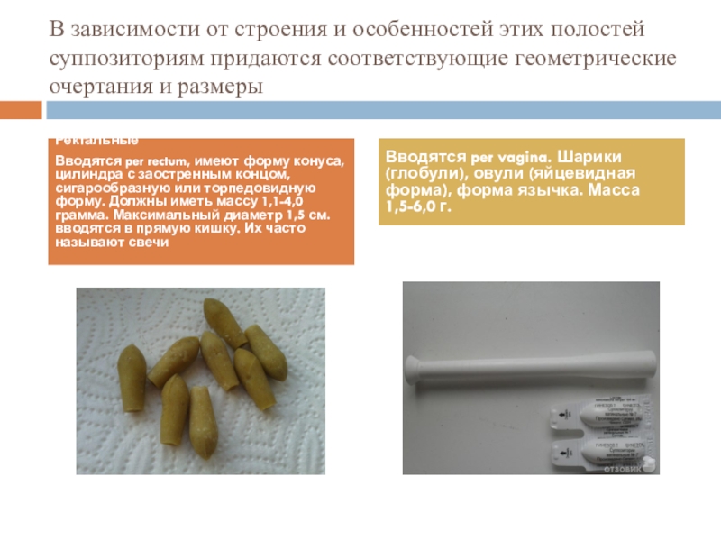 Вводятся per vagina. Шарики (глобули), овули (яйцевидная форма), форма язычка. Масса 1,5-6,0 г.