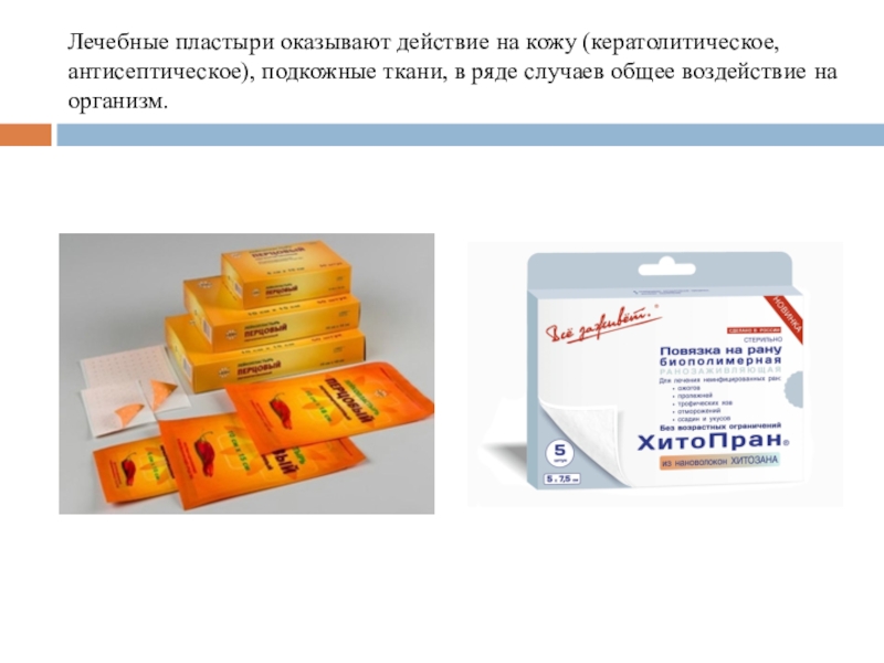 Лечебные пластыри оказывают действие на кожу (кератолитическое, антисептическое), подкожные ткани,