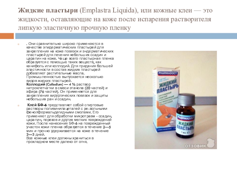 Слайд 44Жидкие пластыри (Emplastra Liquida), или кожные клеи — это жидкости, оставляющие