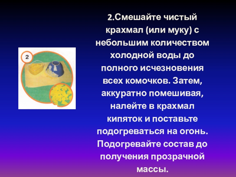 Слайд 32.Смешайте чистый крахмал (или муку) с небольшим количеством холодной воды