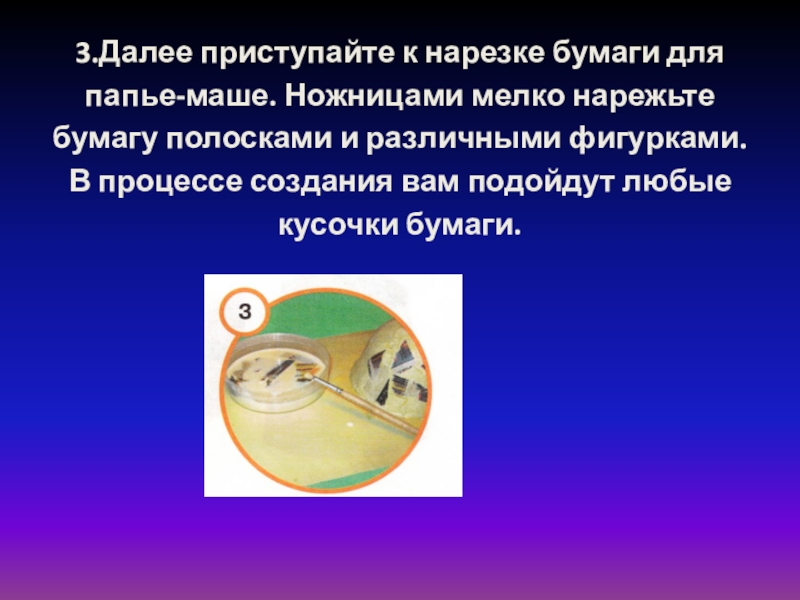 Слайд 43.Далее приступайте к нарезке бумаги для папье-маше. Ножницами мелко нарежьте