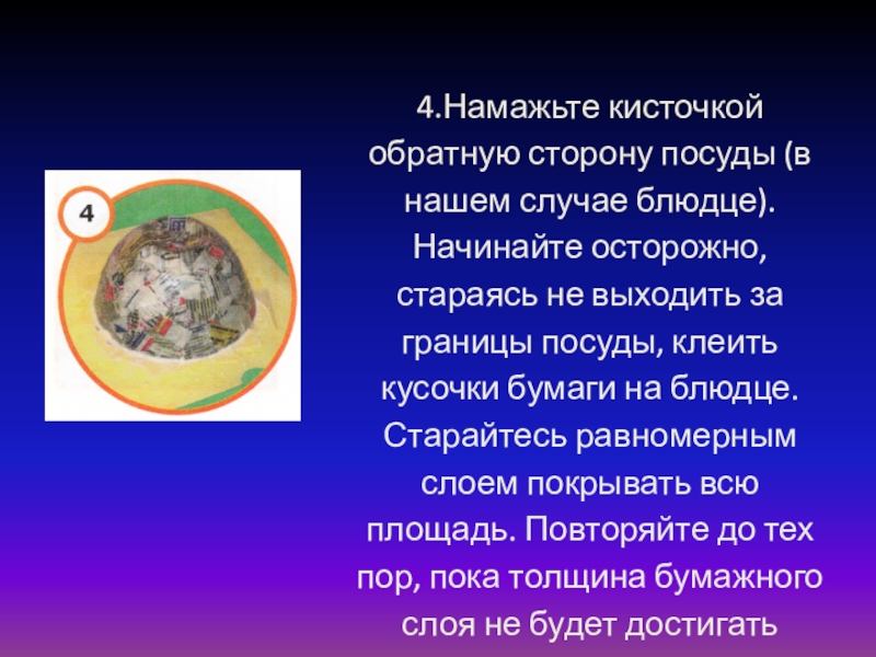 на блюдце. Старайтесь равномерным слоем покрывать всю площадь. Повторяйте до тех пор, пока толщина бумажного слоя не будет достигать нужного вам размера.