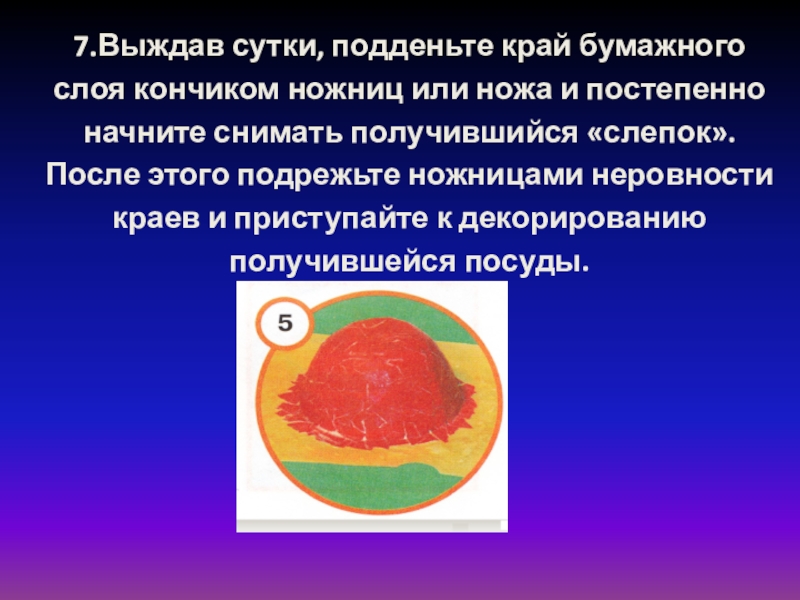 Слайд 77.Выждав сутки, подденьте край бумажного слоя кончиком ножниц или ножа