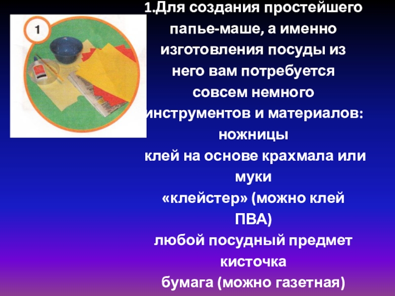 Слайд 21.Для создания простейшего папье-маше, а именно изготовления посуды из него