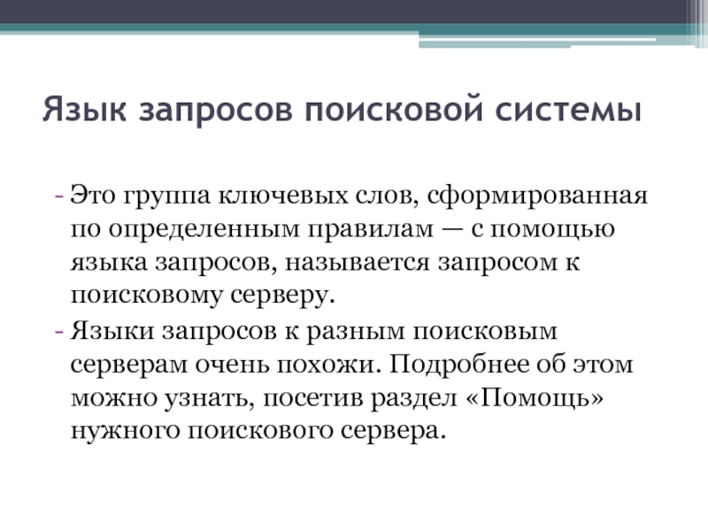 Языки запросов к разным поисковым серверам очень похожи. Подробнее об этом можно узнать, посетив раздел «Помощь» нужного поискового сервера.