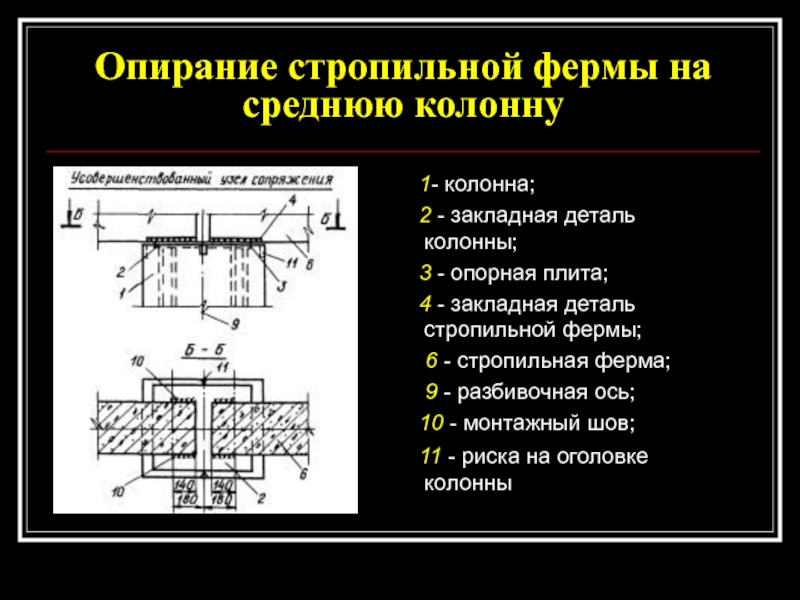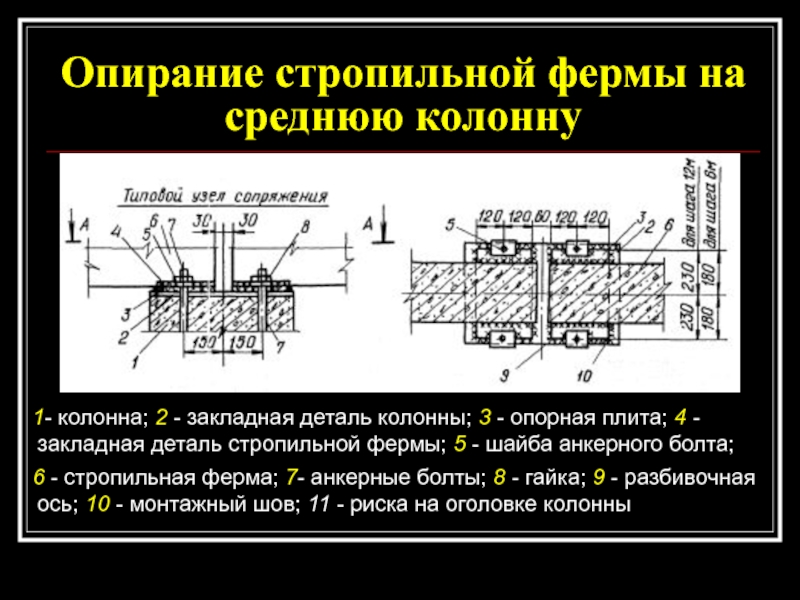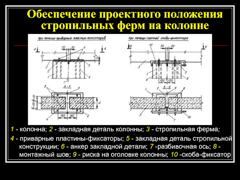 пластины-фиксаторы; 5 - закладная деталь стропильной конструкции; 6 - анкер закладной детали; 7 -разбивочная ось; 8 - монтажный шов; 9 - риска на оголовке колонны; 10 -скоба-фиксатор