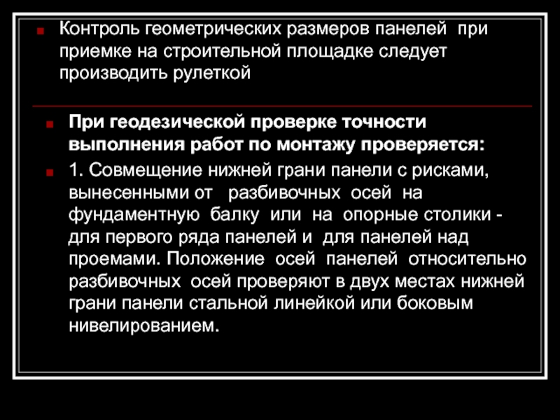 Слайд 81Контроль геометрических размеров панелей при приемке на строительной площадке следует