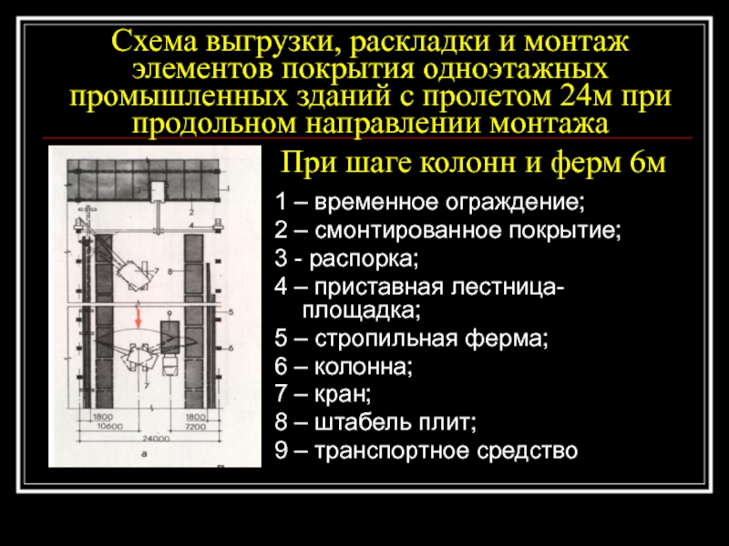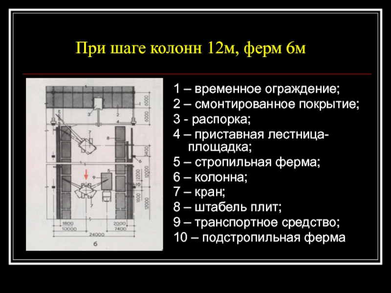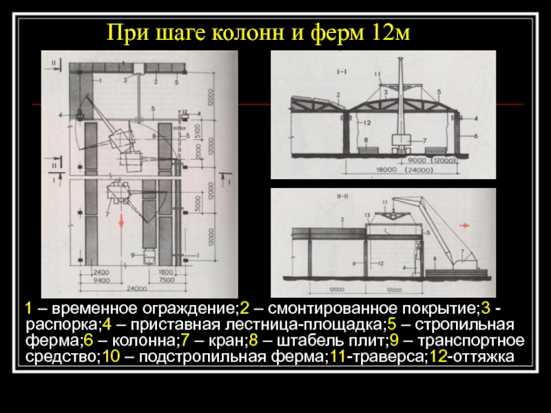 стропильная ферма;6 – колонна;7 – кран;8 – штабель плит;9 – транспортное средство;10 – подстропильная ферма;11-траверса;12-оттяжка