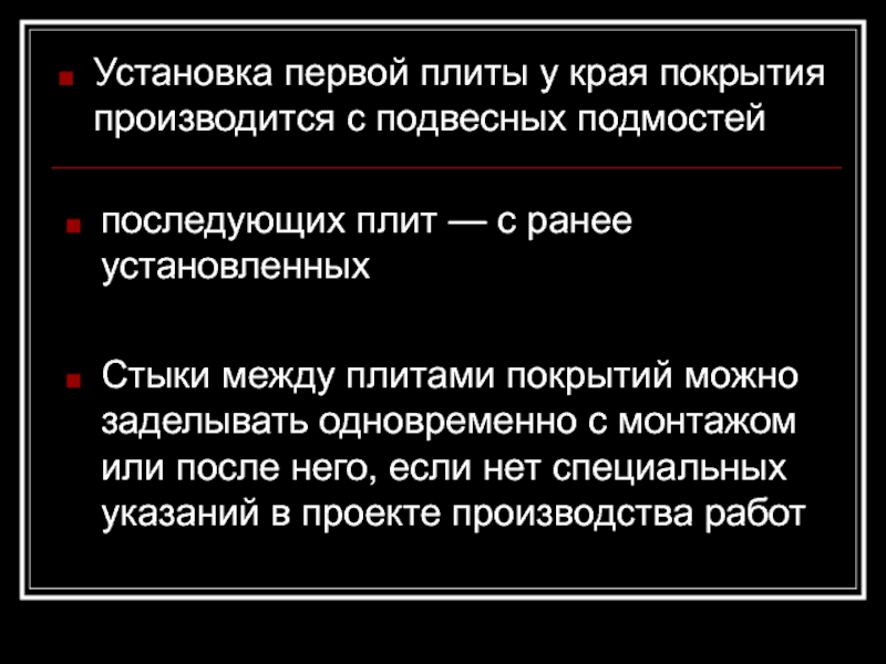 Слайд 72Установка первой плиты у края покрытия производится с подвесных подмостей
