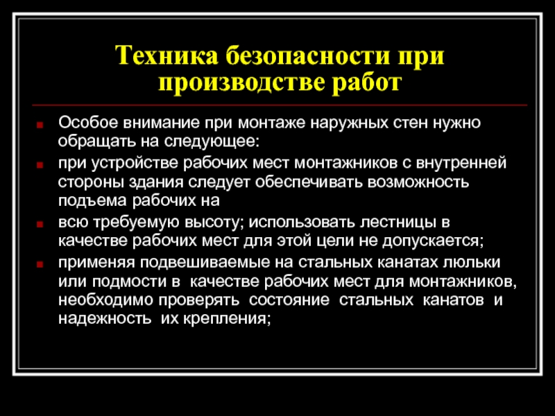 применяя подвешиваемые на стальных канатах люльки или подмости в качестве рабочих мест для монтажников, необходимо проверять состояние стальных канатов и надежность их крепления;