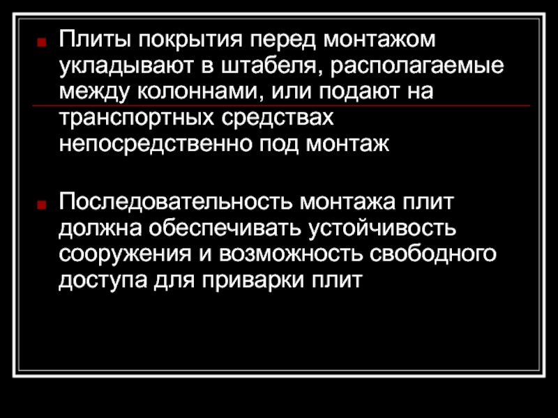 Слайд 67Плиты покрытия перед монтажом укладывают в штабеля, располагаемые между колоннами,
