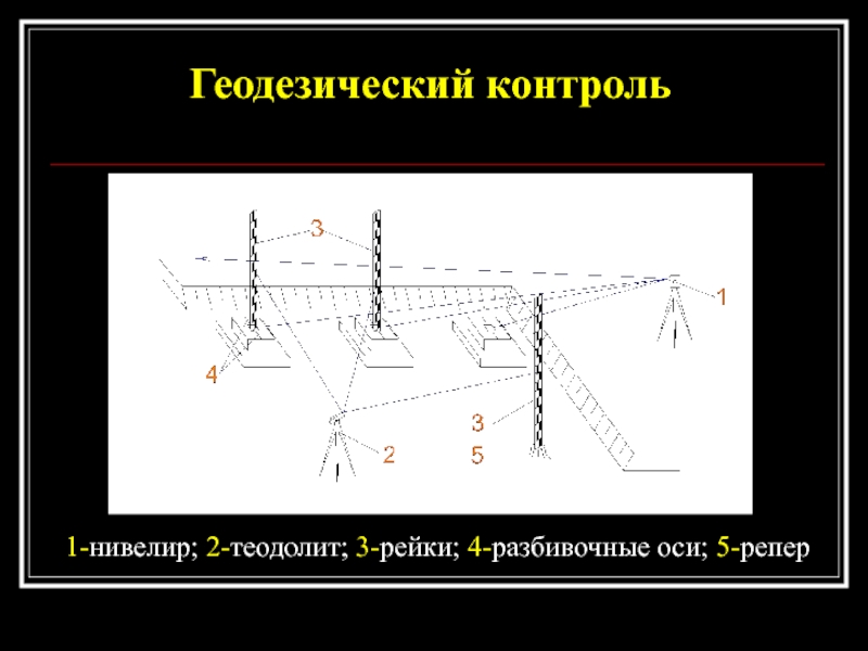 1-нивелир; 2-теодолит; 3-рейки; 4-разбивочные оси; 5-репер