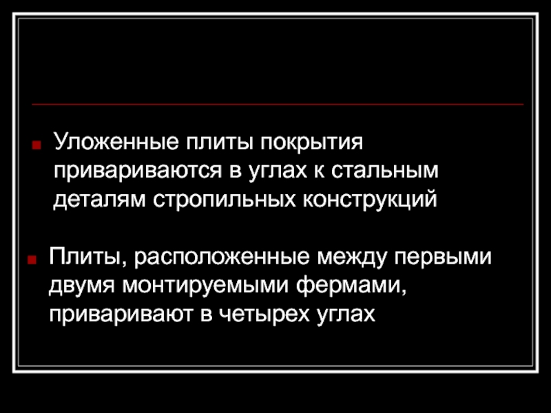 Слайд 69Уложенные плиты покрытия привариваются в углах к стальным деталям стропильных