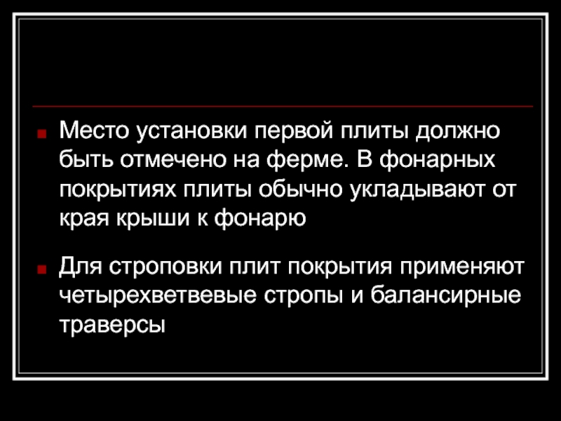 Слайд 68Место установки первой плиты должно быть отмечено на ферме. В