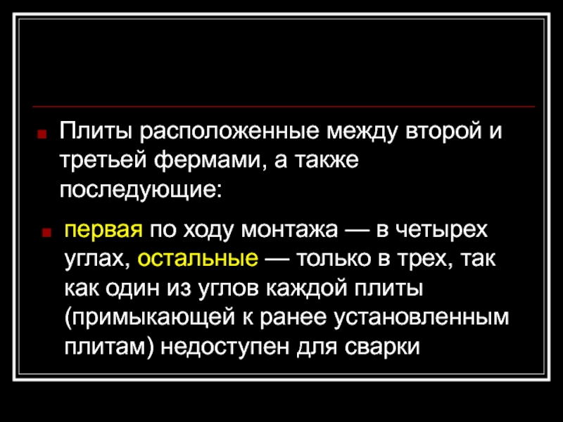 Плиты, расположенные между первыми двумя монтируемыми фермами, приваривают в четырех