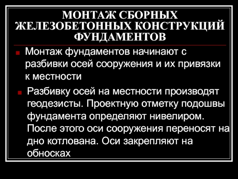 Слайд 9МОНТАЖ СБОРНЫХ ЖЕЛЕЗОБЕТОННЫХ КОНСТРУКЦИЙ ФУНДАМЕНТОВ