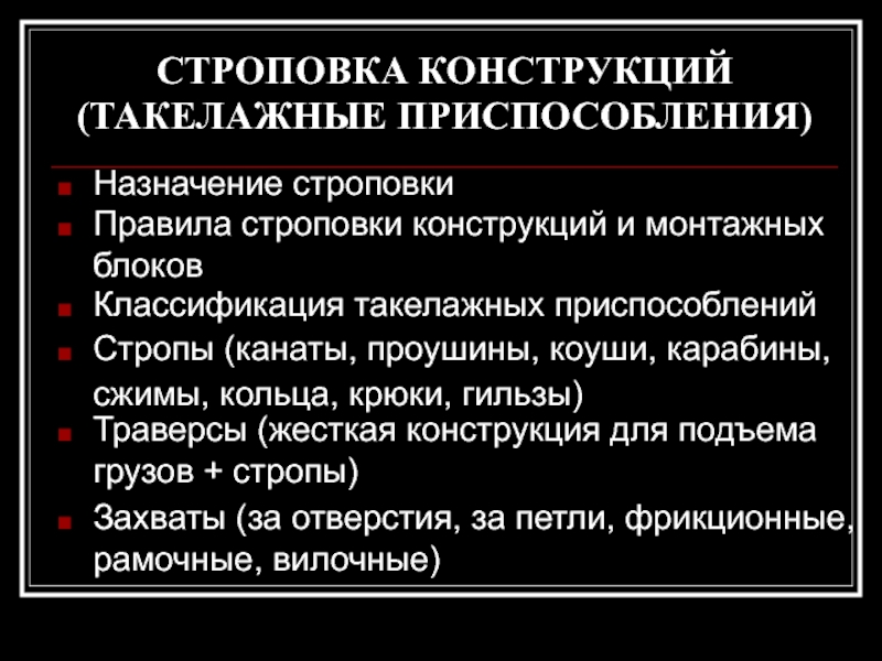 Слайд 9СТРОПОВКА КОНСТРУКЦИЙ (ТАКЕЛАЖНЫЕ ПРИСПОСОБЛЕНИЯ)