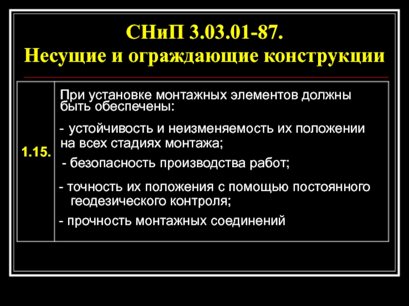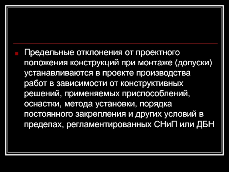 Слайд 85Предельные отклонения от проектного положения конструкций при монтаже (допуски) устанавливаются