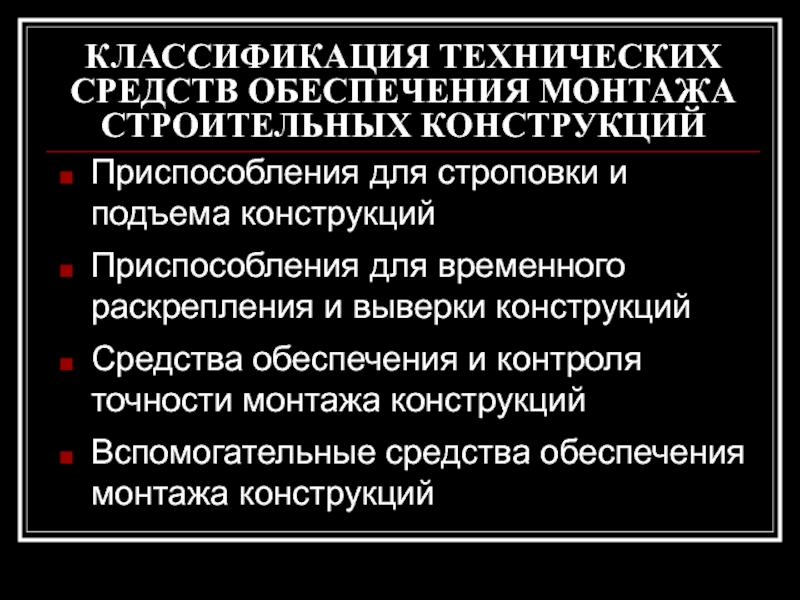 Слайд 8КЛАССИФИКАЦИЯ ТЕХНИЧЕСКИХ СРЕДСТВ ОБЕСПЕЧЕНИЯ МОНТАЖА СТРОИТЕЛЬНЫХ КОНСТРУКЦИЙ