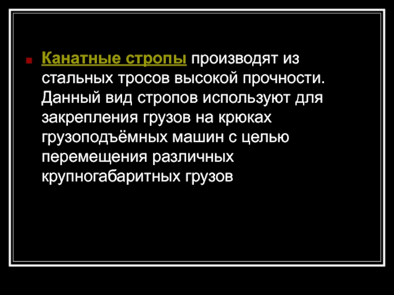 Слайд 17Канатные стропы производят из стальных тросов высокой прочности. Данный вид