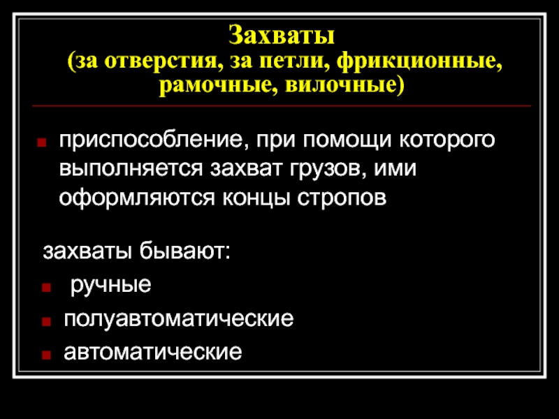 Захваты (за отверстия, за петли, фрикционные, рамочные, вилочные)