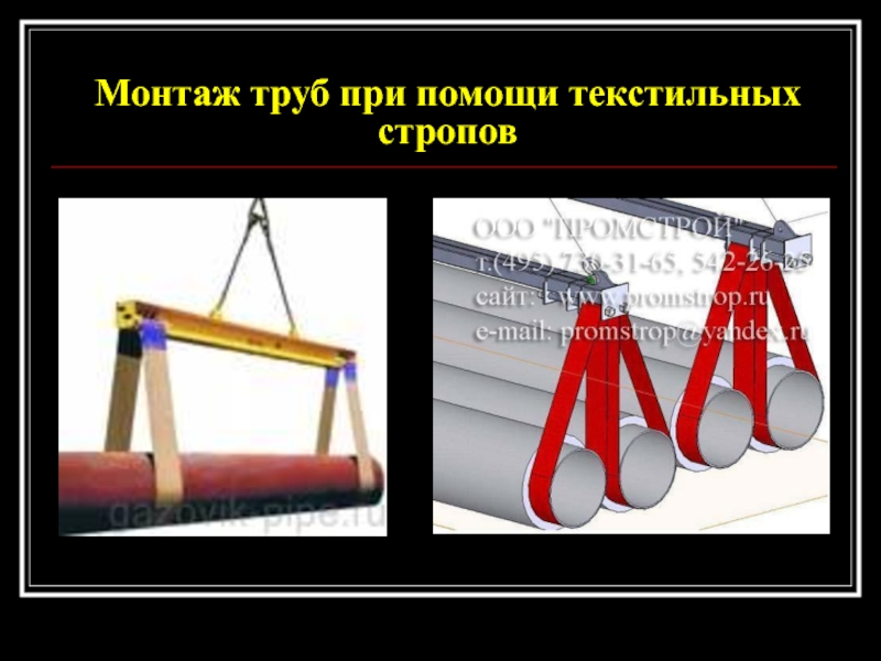 Слайд 26Монтаж труб при помощи текстильных стропов