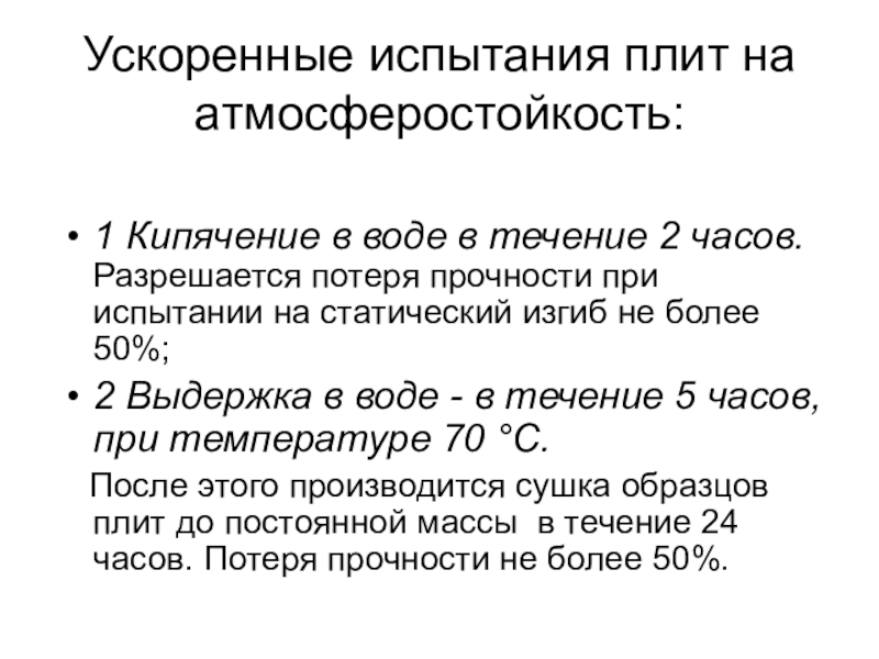 После этого производится сушка образцов плит до постоянной массы в течение 24 часов. Потеря прочности не более 50%.