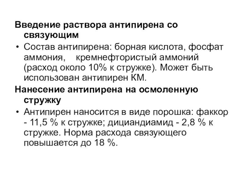 Антипирен наносится в виде порошка: факкор - 11,5 % к стружке; дициандиамид - 2,8 % к стружке. Норма расхода связующего повышается до 18 %.