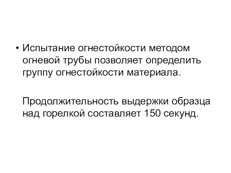 Слайд 18Испытание огнестойкости методом огневой трубы позволяет определить группу огнестойкости материала.