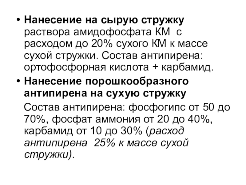 20% сухого КМ к массе сухой стружки. Состав антипирена: ортофосфорная