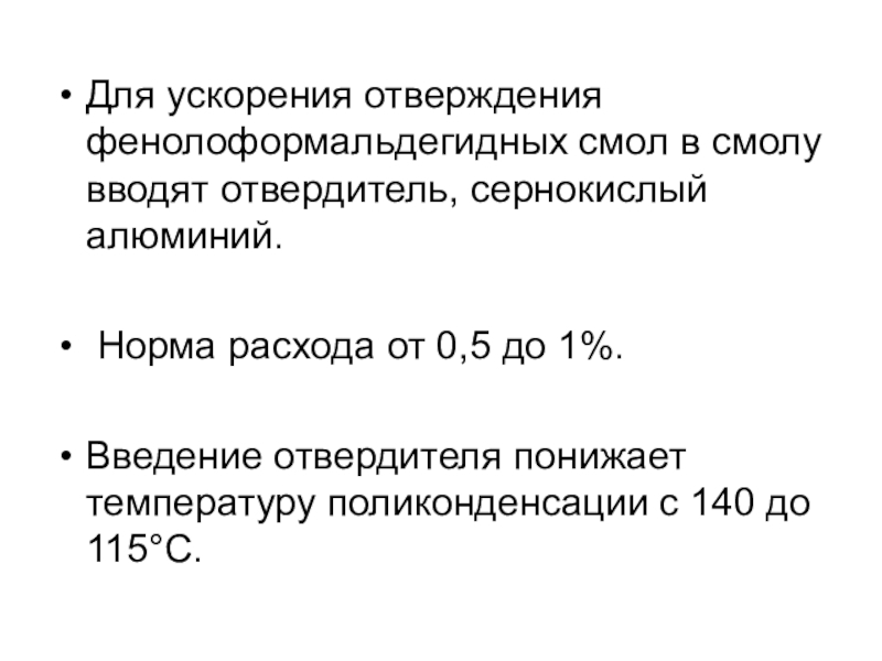 Слайд 11Для ускорения отверждения фенолоформальдегидных смол в смолу вводят отвердитель, сернокислый