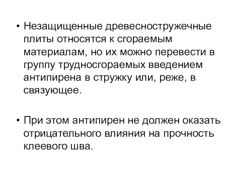 Слайд 19Незащищенные древесностружечные плиты относятся к сгораемым материалам, но их можно