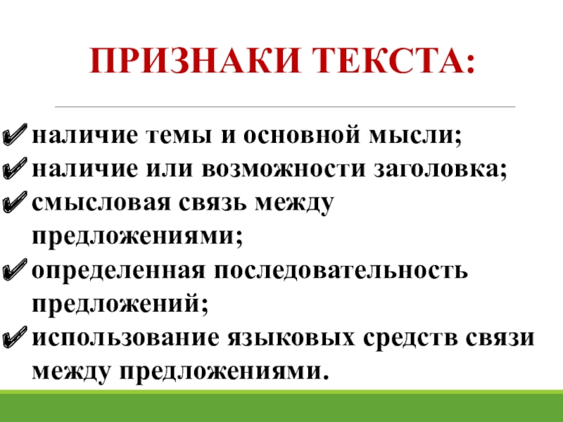 Слайд 5ПРИЗНАКИ ТЕКСТА: