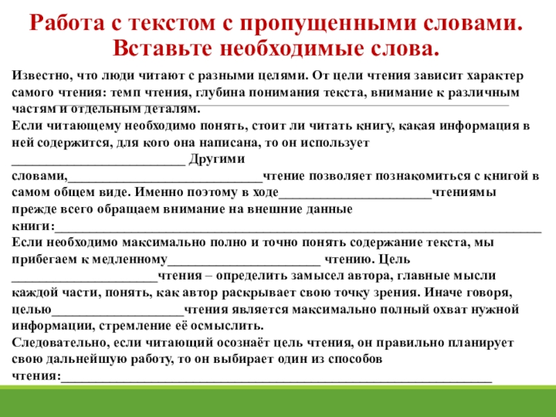 Если необходимо максимально полно и точно понять содержание текста, мы прибегаем к медленному______________________ чтению. Цель _____________________чтения – определить замысел автора, главные мысли каждой части, понять, как автор раскрывает свою точку зрения. Иначе говоря, целью___________________чтения является максимально полный охват нужной информации, стремление её осмыслить.