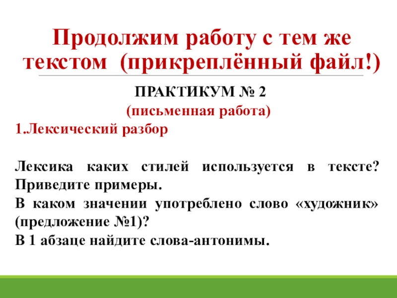 Слайд 20Продолжим работу с тем же текстом (прикреплённый файл!)