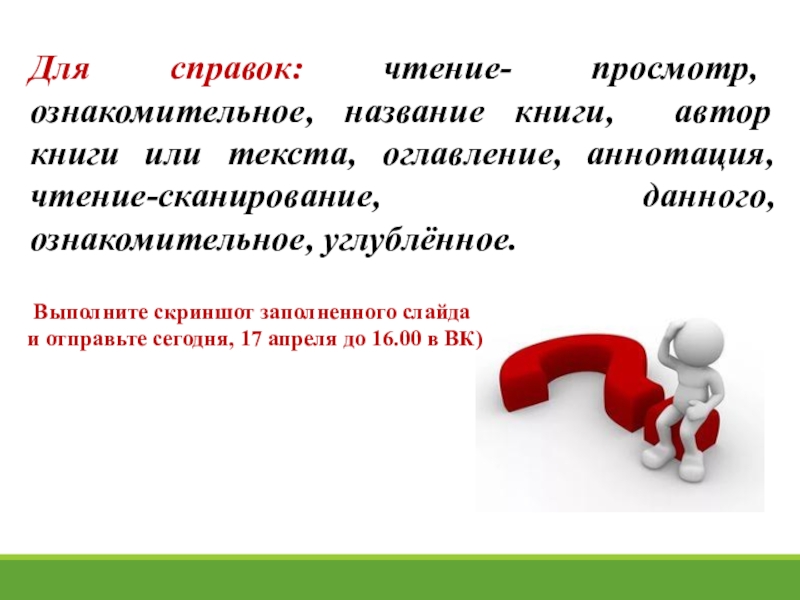 Слайд 19Для справок: чтение- просмотр, ознакомительное, название книги, автор книги или